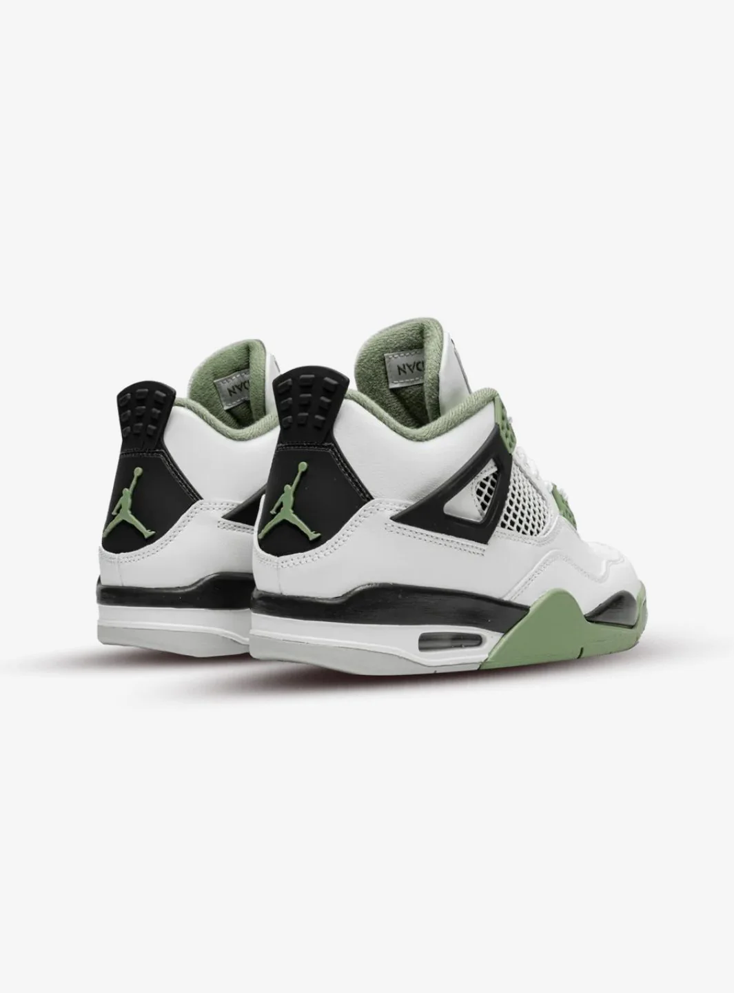 Le Air Jordan 4 Seafoam (W) adottano lo stesso schema di colori delle Jordan 4 Fire Red e delle Jordan 4 Military Blue. Queste sneaker sono caratterizzate da una tomaia in pelle bianca accoppiata a dettagli neri come le linguette e il tacco. Il tradizionale Cage TPU è presente sul pannello laterale in una tonalità bianca. Sottili tocchi di verde mare sono distribuiti su intersuola, mudguard, fodera del calzino e sui loghi della linguetta e del tallone, creando un contrasto accattivante.