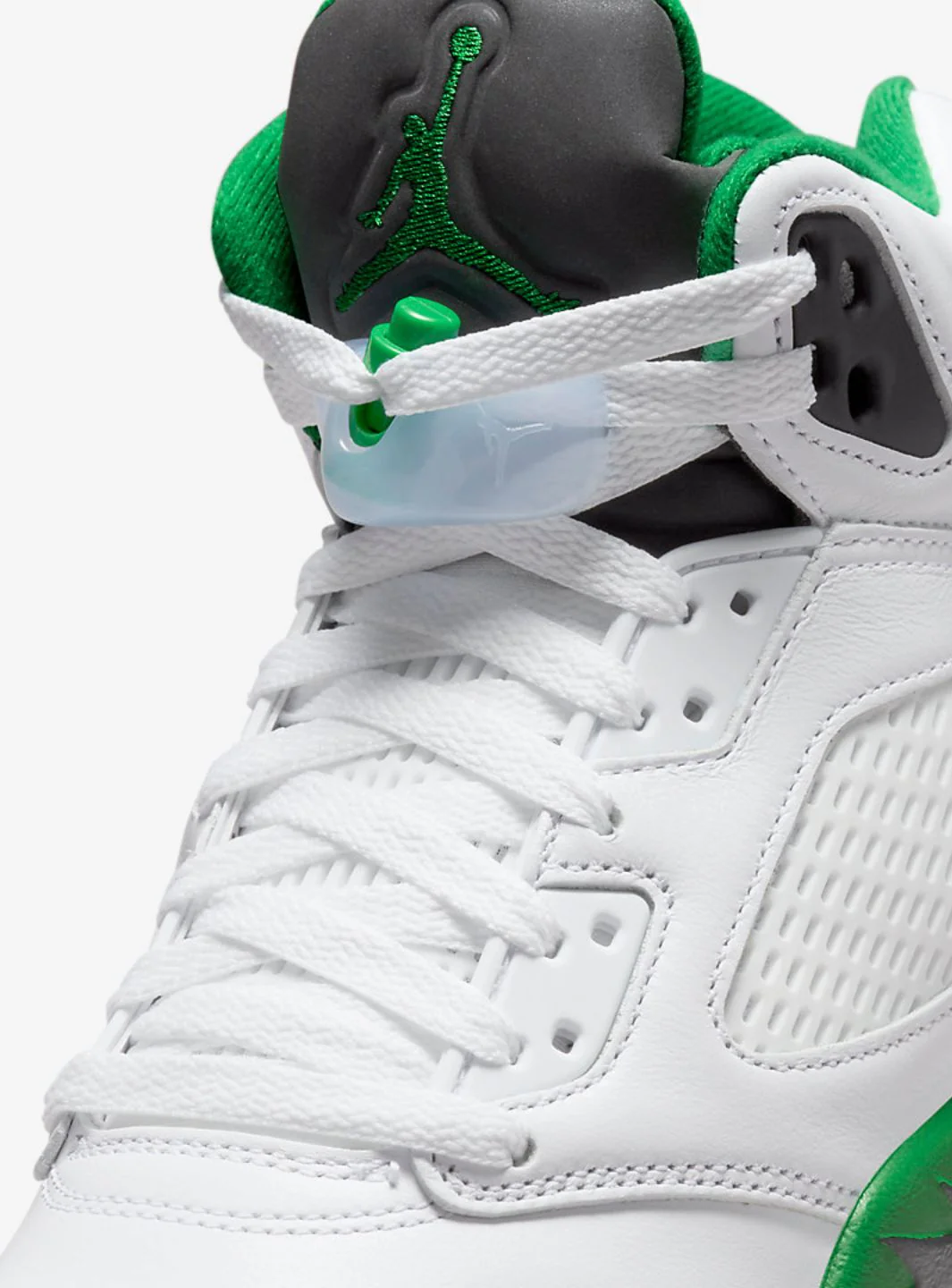 Il brand Jordan, in occasione di San Patrizio, ha presentato una nuova Air Jordan 5 nella colorazione Lucky Green, che si distingue per i suoi accenti verdi caratteristici. Dettagli come quelli sulla soletta interna, sul colletto imbottito, sul toggle del sistema di allacciatura e sulla suola angolata donano un tocco distintivo alla scarpa. Il logo Jumpman sul tallone è grigio, mentre quello sulla linguetta è ricamato con filo Lucky Green, aggiungendo un ulteriore elemento di originalità.