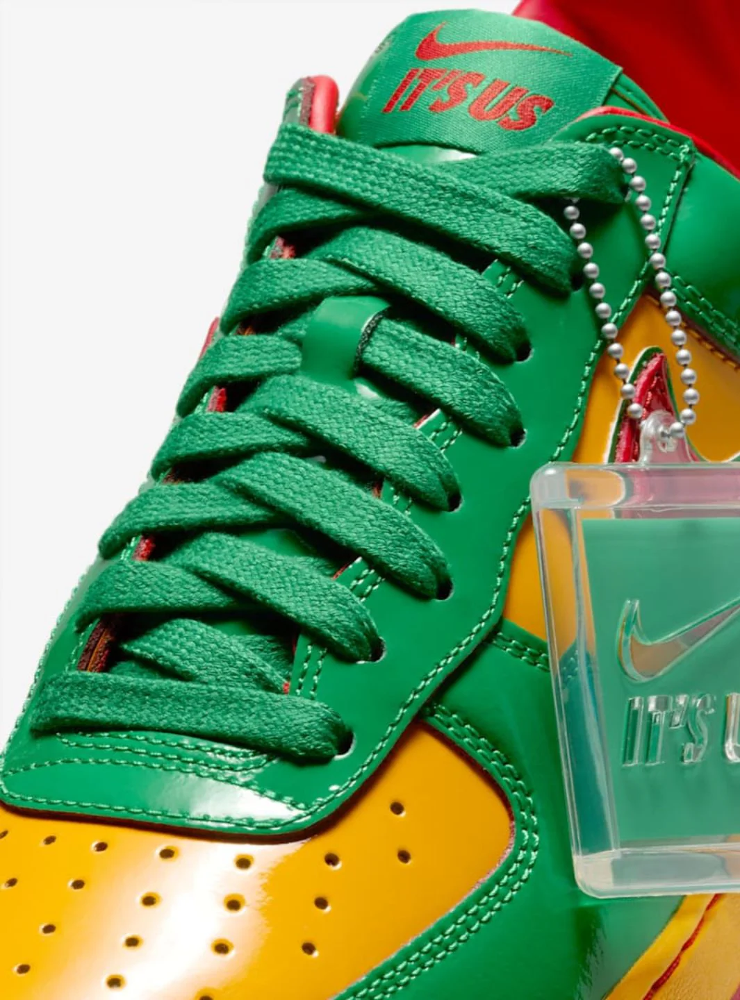 La tomaia in vernice Lucky Green cattura subito l’attenzione, mentre i dettagli in University Gold sulla midsole e nei pannelli laterali bilanciano il look con eleganza e stile. Il tocco di University Red sullo Swoosh Nike e sulla suola aggiunge dinamismo e carattere, rendendo la sneaker un pezzo d’impatto per chi ama osare con le calzature.